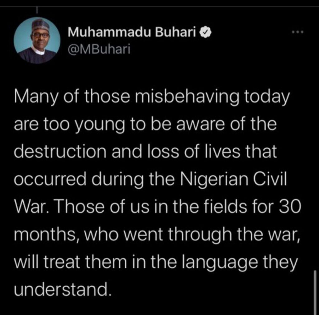 “Many of those misbehaving today are too young to be aware of the destruction and loss of lives that occurred during the Nigerian Civil War. Those of us in the fields for 30 months, who went through the war, will treat them in the language they understand,” the now deleted tweet posted via his official twitter account read in part.