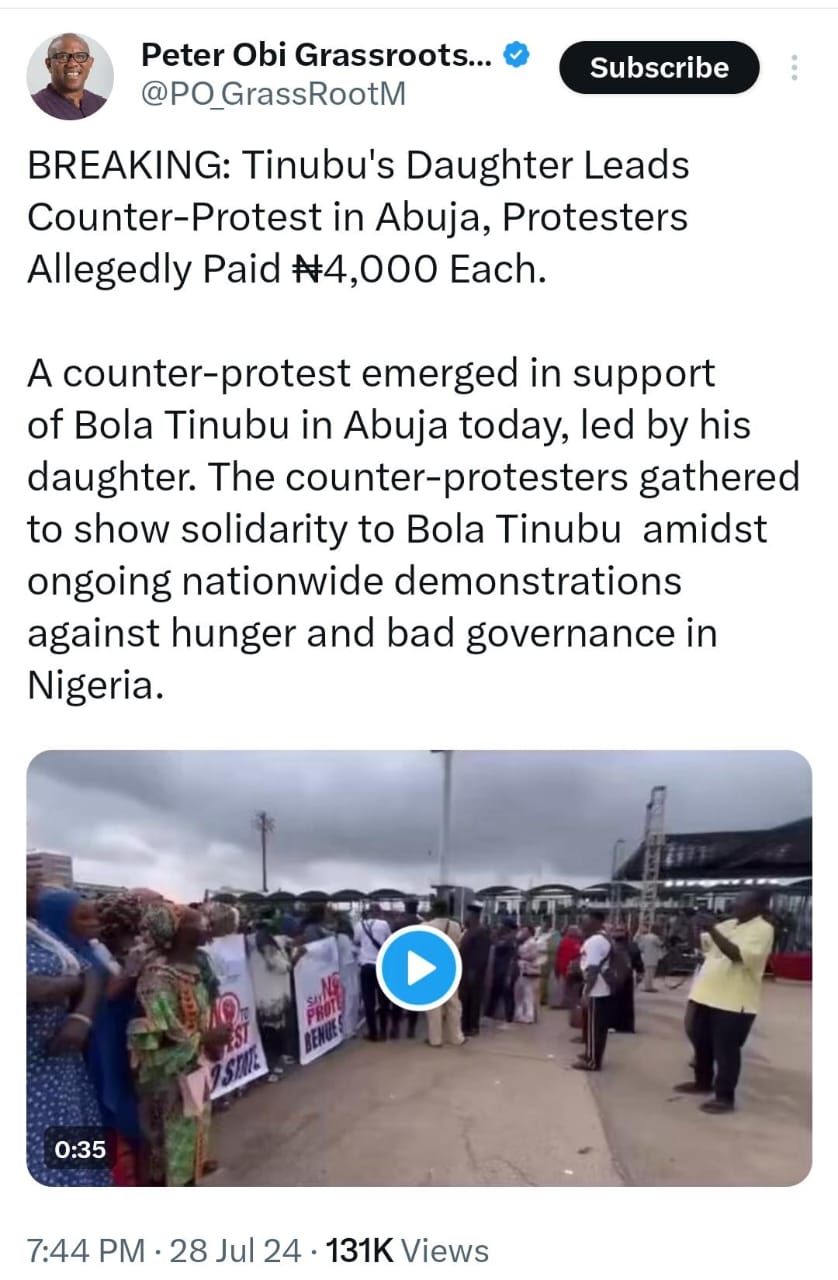We have taken cognisance of a mischievous publication circulated in some sections of the press, claiming that our esteemed Matron, the Iyaloja General of Nigeria and First Daughter of the Federation led a counter-protest in Abuja, where protesters were allegedly paid ₦4,000 each.